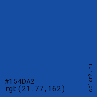 Цвет #154DA2 в цветовой модели RGB обозначается тремя октетами (21, 77, 162) в десятичном формате и #154DA2 в шестнадцатиричном (hex) формате, которые являются интенсивностью красного 21 (hex 15), интенсивность зелёного 77 (hex 4D) и интенсивность синего 162 (hex A2).