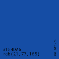 Цвет #154DA5 в цветовой модели RGB обозначается тремя октетами (21, 77, 165) в десятичном формате и #154DA5 в шестнадцатиричном (hex) формате, которые являются интенсивностью красного 21 (hex 15), интенсивность зелёного 77 (hex 4D) и интенсивность синего 165 (hex A5).