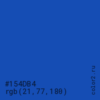 Цвет #154DB4 в цветовой модели RGB обозначается тремя октетами (21, 77, 180) в десятичном формате и #154DB4 в шестнадцатиричном (hex) формате, которые являются интенсивностью красного 21 (hex 15), интенсивность зелёного 77 (hex 4D) и интенсивность синего 180 (hex B4).