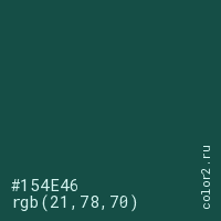 Цвет #154E46 в цветовой модели RGB обозначается тремя октетами (21, 78, 70) в десятичном формате и #154E46 в шестнадцатиричном (hex) формате, которые являются интенсивностью красного 21 (hex 15), интенсивность зелёного 78 (hex 4E) и интенсивность синего 70 (hex 46).