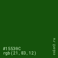 Цвет #15530C в цветовой модели RGB обозначается тремя октетами (21, 83, 12) в десятичном формате и #15530C в шестнадцатиричном (hex) формате, которые являются интенсивностью красного 21 (hex 15), интенсивность зелёного 83 (hex 53) и интенсивность синего 12 (hex 0C).