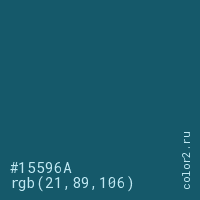 Цвет #15596A в цветовой модели RGB обозначается тремя октетами (21, 89, 106) в десятичном формате и #15596A в шестнадцатиричном (hex) формате, которые являются интенсивностью красного 21 (hex 15), интенсивность зелёного 89 (hex 59) и интенсивность синего 106 (hex 6A).