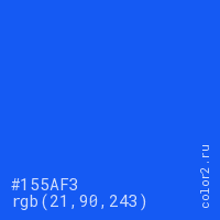 Цвет #155AF3 в цветовой модели RGB обозначается тремя октетами (21, 90, 243) в десятичном формате и #155AF3 в шестнадцатиричном (hex) формате, которые являются интенсивностью красного 21 (hex 15), интенсивность зелёного 90 (hex 5A) и интенсивность синего 243 (hex F3).