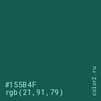 Цвет #155B4F в цветовой модели RGB обозначается тремя октетами (21, 91, 79) в десятичном формате и #155B4F в шестнадцатиричном (hex) формате, которые являются интенсивностью красного 21 (hex 15), интенсивность зелёного 91 (hex 5B) и интенсивность синего 79 (hex 4F).