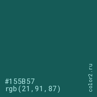 Цвет #155B57 в цветовой модели RGB обозначается тремя октетами (21, 91, 87) в десятичном формате и #155B57 в шестнадцатиричном (hex) формате, которые являются интенсивностью красного 21 (hex 15), интенсивность зелёного 91 (hex 5B) и интенсивность синего 87 (hex 57).