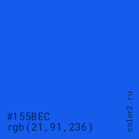 Цвет #155BEC в цветовой модели RGB обозначается тремя октетами (21, 91, 236) в десятичном формате и #155BEC в шестнадцатиричном (hex) формате, которые являются интенсивностью красного 21 (hex 15), интенсивность зелёного 91 (hex 5B) и интенсивность синего 236 (hex EC).