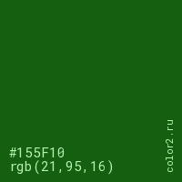 Цвет #155F10 в цветовой модели RGB обозначается тремя октетами (21, 95, 16) в десятичном формате и #155F10 в шестнадцатиричном (hex) формате, которые являются интенсивностью красного 21 (hex 15), интенсивность зелёного 95 (hex 5F) и интенсивность синего 16 (hex 10).