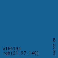 Цвет #156194 в цветовой модели RGB обозначается тремя октетами (21, 97, 148) в десятичном формате и #156194 в шестнадцатиричном (hex) формате, которые являются интенсивностью красного 21 (hex 15), интенсивность зелёного 97 (hex 61) и интенсивность синего 148 (hex 94).