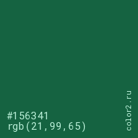 Цвет #156341 в цветовой модели RGB обозначается тремя октетами (21, 99, 65) в десятичном формате и #156341 в шестнадцатиричном (hex) формате, которые являются интенсивностью красного 21 (hex 15), интенсивность зелёного 99 (hex 63) и интенсивность синего 65 (hex 41).