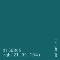 Цвет #156368 в цветовой модели RGB обозначается тремя октетами (21, 99, 104) в десятичном формате и #156368 в шестнадцатиричном (hex) формате, которые являются интенсивностью красного 21 (hex 15), интенсивность зелёного 99 (hex 63) и интенсивность синего 104 (hex 68).