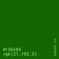 Цвет #156603 в цветовой модели RGB обозначается тремя октетами (21, 102, 3) в десятичном формате и #156603 в шестнадцатиричном (hex) формате, которые являются интенсивностью красного 21 (hex 15), интенсивность зелёного 102 (hex 66) и интенсивность синего 3 (hex 03).