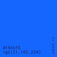 Цвет #1566FE в цветовой модели RGB обозначается тремя октетами (21, 102, 254) в десятичном формате и #1566FE в шестнадцатиричном (hex) формате, которые являются интенсивностью красного 21 (hex 15), интенсивность зелёного 102 (hex 66) и интенсивность синего 254 (hex FE).