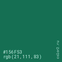 Цвет #156F53 в цветовой модели RGB обозначается тремя октетами (21, 111, 83) в десятичном формате и #156F53 в шестнадцатиричном (hex) формате, которые являются интенсивностью красного 21 (hex 15), интенсивность зелёного 111 (hex 6F) и интенсивность синего 83 (hex 53).