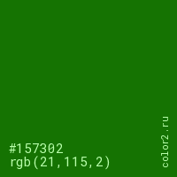 Цвет #157302 в цветовой модели RGB обозначается тремя октетами (21, 115, 2) в десятичном формате и #157302 в шестнадцатиричном (hex) формате, которые являются интенсивностью красного 21 (hex 15), интенсивность зелёного 115 (hex 73) и интенсивность синего 2 (hex 02).