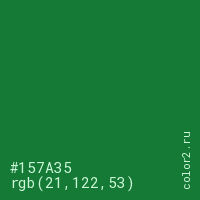 Цвет #157A35 в цветовой модели RGB обозначается тремя октетами (21, 122, 53) в десятичном формате и #157A35 в шестнадцатиричном (hex) формате, которые являются интенсивностью красного 21 (hex 15), интенсивность зелёного 122 (hex 7A) и интенсивность синего 53 (hex 35).