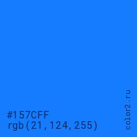 Цвет #157CFF в цветовой модели RGB обозначается тремя октетами (21, 124, 255) в десятичном формате и #157CFF в шестнадцатиричном (hex) формате, которые являются интенсивностью красного 21 (hex 15), интенсивность зелёного 124 (hex 7C) и интенсивность синего 255 (hex FF).