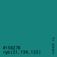 Цвет #15827B в цветовой модели RGB обозначается тремя октетами (21, 130, 123) в десятичном формате и #15827B в шестнадцатиричном (hex) формате, которые являются интенсивностью красного 21 (hex 15), интенсивность зелёного 130 (hex 82) и интенсивность синего 123 (hex 7B).