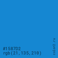 Цвет #1587D2 в цветовой модели RGB обозначается тремя октетами (21, 135, 210) в десятичном формате и #1587D2 в шестнадцатиричном (hex) формате, которые являются интенсивностью красного 21 (hex 15), интенсивность зелёного 135 (hex 87) и интенсивность синего 210 (hex D2).