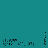 Цвет #158B89 в цветовой модели RGB обозначается тремя октетами (21, 139, 137) в десятичном формате и #158B89 в шестнадцатиричном (hex) формате, которые являются интенсивностью красного 21 (hex 15), интенсивность зелёного 139 (hex 8B) и интенсивность синего 137 (hex 89).