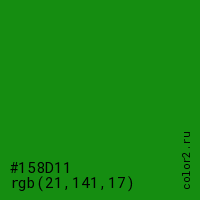 Цвет #158D11 в цветовой модели RGB обозначается тремя октетами (21, 141, 17) в десятичном формате и #158D11 в шестнадцатиричном (hex) формате, которые являются интенсивностью красного 21 (hex 15), интенсивность зелёного 141 (hex 8D) и интенсивность синего 17 (hex 11).