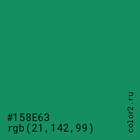 Цвет #158E63 в цветовой модели RGB обозначается тремя октетами (21, 142, 99) в десятичном формате и #158E63 в шестнадцатиричном (hex) формате, которые являются интенсивностью красного 21 (hex 15), интенсивность зелёного 142 (hex 8E) и интенсивность синего 99 (hex 63).