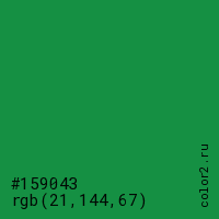 Цвет #159043 в цветовой модели RGB обозначается тремя октетами (21, 144, 67) в десятичном формате и #159043 в шестнадцатиричном (hex) формате, которые являются интенсивностью красного 21 (hex 15), интенсивность зелёного 144 (hex 90) и интенсивность синего 67 (hex 43).
