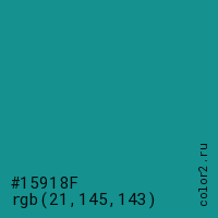 Цвет #15918F в цветовой модели RGB обозначается тремя октетами (21, 145, 143) в десятичном формате и #15918F в шестнадцатиричном (hex) формате, которые являются интенсивностью красного 21 (hex 15), интенсивность зелёного 145 (hex 91) и интенсивность синего 143 (hex 8F).