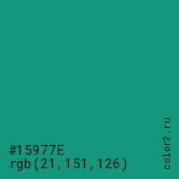 Цвет #15977E в цветовой модели RGB обозначается тремя октетами (21, 151, 126) в десятичном формате и #15977E в шестнадцатиричном (hex) формате, которые являются интенсивностью красного 21 (hex 15), интенсивность зелёного 151 (hex 97) и интенсивность синего 126 (hex 7E).