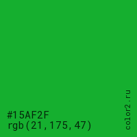 Цвет #15AF2F в цветовой модели RGB обозначается тремя октетами (21, 175, 47) в десятичном формате и #15AF2F в шестнадцатиричном (hex) формате, которые являются интенсивностью красного 21 (hex 15), интенсивность зелёного 175 (hex AF) и интенсивность синего 47 (hex 2F).
