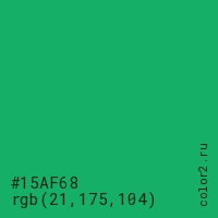 Цвет #15AF68 в цветовой модели RGB обозначается тремя октетами (21, 175, 104) в десятичном формате и #15AF68 в шестнадцатиричном (hex) формате, которые являются интенсивностью красного 21 (hex 15), интенсивность зелёного 175 (hex AF) и интенсивность синего 104 (hex 68).