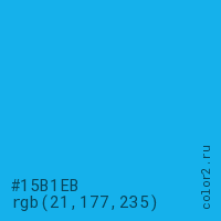 Цвет #15B1EB в цветовой модели RGB обозначается тремя октетами (21, 177, 235) в десятичном формате и #15B1EB в шестнадцатиричном (hex) формате, которые являются интенсивностью красного 21 (hex 15), интенсивность зелёного 177 (hex B1) и интенсивность синего 235 (hex EB).