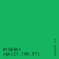 Цвет #15B461 в цветовой модели RGB обозначается тремя октетами (21, 180, 97) в десятичном формате и #15B461 в шестнадцатиричном (hex) формате, которые являются интенсивностью красного 21 (hex 15), интенсивность зелёного 180 (hex B4) и интенсивность синего 97 (hex 61).