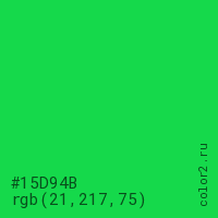 Цвет #15D94B в цветовой модели RGB обозначается тремя октетами (21, 217, 75) в десятичном формате и #15D94B в шестнадцатиричном (hex) формате, которые являются интенсивностью красного 21 (hex 15), интенсивность зелёного 217 (hex D9) и интенсивность синего 75 (hex 4B).