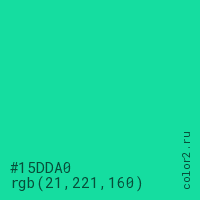 Цвет #15DDA0 в цветовой модели RGB обозначается тремя октетами (21, 221, 160) в десятичном формате и #15DDA0 в шестнадцатиричном (hex) формате, которые являются интенсивностью красного 21 (hex 15), интенсивность зелёного 221 (hex DD) и интенсивность синего 160 (hex A0).