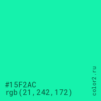 Цвет #15F2AC в цветовой модели RGB обозначается тремя октетами (21, 242, 172) в десятичном формате и #15F2AC в шестнадцатиричном (hex) формате, которые являются интенсивностью красного 21 (hex 15), интенсивность зелёного 242 (hex F2) и интенсивность синего 172 (hex AC).
