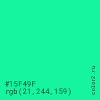 Цвет #15F49F в цветовой модели RGB обозначается тремя октетами (21, 244, 159) в десятичном формате и #15F49F в шестнадцатиричном (hex) формате, которые являются интенсивностью красного 21 (hex 15), интенсивность зелёного 244 (hex F4) и интенсивность синего 159 (hex 9F).