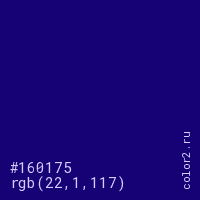 Цвет #160175 в цветовой модели RGB обозначается тремя октетами (22, 1, 117) в десятичном формате и #160175 в шестнадцатиричном (hex) формате, которые являются интенсивностью красного 22 (hex 16), интенсивность зелёного 1 (hex 01) и интенсивность синего 117 (hex 75).