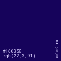 Цвет #16035B в цветовой модели RGB обозначается тремя октетами (22, 3, 91) в десятичном формате и #16035B в шестнадцатиричном (hex) формате, которые являются интенсивностью красного 22 (hex 16), интенсивность зелёного 3 (hex 03) и интенсивность синего 91 (hex 5B).