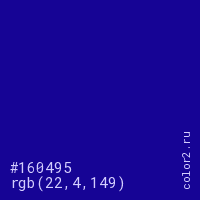 Цвет #160495 в цветовой модели RGB обозначается тремя октетами (22, 4, 149) в десятичном формате и #160495 в шестнадцатиричном (hex) формате, которые являются интенсивностью красного 22 (hex 16), интенсивность зелёного 4 (hex 04) и интенсивность синего 149 (hex 95).