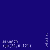 Цвет #160679 в цветовой модели RGB обозначается тремя октетами (22, 6, 121) в десятичном формате и #160679 в шестнадцатиричном (hex) формате, которые являются интенсивностью красного 22 (hex 16), интенсивность зелёного 6 (hex 06) и интенсивность синего 121 (hex 79).