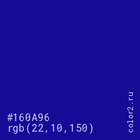 Цвет #160A96 в цветовой модели RGB обозначается тремя октетами (22, 10, 150) в десятичном формате и #160A96 в шестнадцатиричном (hex) формате, которые являются интенсивностью красного 22 (hex 16), интенсивность зелёного 10 (hex 0A) и интенсивность синего 150 (hex 96).