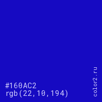 Цвет #160AC2 в цветовой модели RGB обозначается тремя октетами (22, 10, 194) в десятичном формате и #160AC2 в шестнадцатиричном (hex) формате, которые являются интенсивностью красного 22 (hex 16), интенсивность зелёного 10 (hex 0A) и интенсивность синего 194 (hex C2).
