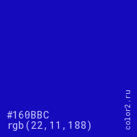 Цвет #160BBC в цветовой модели RGB обозначается тремя октетами (22, 11, 188) в десятичном формате и #160BBC в шестнадцатиричном (hex) формате, которые являются интенсивностью красного 22 (hex 16), интенсивность зелёного 11 (hex 0B) и интенсивность синего 188 (hex BC).