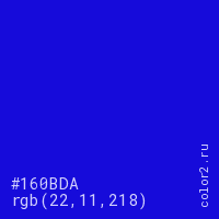 Цвет #160BDA в цветовой модели RGB обозначается тремя октетами (22, 11, 218) в десятичном формате и #160BDA в шестнадцатиричном (hex) формате, которые являются интенсивностью красного 22 (hex 16), интенсивность зелёного 11 (hex 0B) и интенсивность синего 218 (hex DA).
