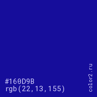 Цвет #160D9B в цветовой модели RGB обозначается тремя октетами (22, 13, 155) в десятичном формате и #160D9B в шестнадцатиричном (hex) формате, которые являются интенсивностью красного 22 (hex 16), интенсивность зелёного 13 (hex 0D) и интенсивность синего 155 (hex 9B).