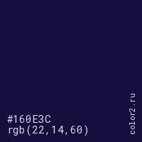 Цвет #160E3C в цветовой модели RGB обозначается тремя октетами (22, 14, 60) в десятичном формате и #160E3C в шестнадцатиричном (hex) формате, которые являются интенсивностью красного 22 (hex 16), интенсивность зелёного 14 (hex 0E) и интенсивность синего 60 (hex 3C).