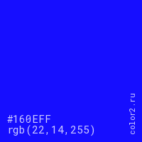 Цвет #160EFF в цветовой модели RGB обозначается тремя октетами (22, 14, 255) в десятичном формате и #160EFF в шестнадцатиричном (hex) формате, которые являются интенсивностью красного 22 (hex 16), интенсивность зелёного 14 (hex 0E) и интенсивность синего 255 (hex FF).