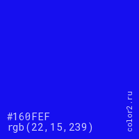 Цвет #160FEF в цветовой модели RGB обозначается тремя октетами (22, 15, 239) в десятичном формате и #160FEF в шестнадцатиричном (hex) формате, которые являются интенсивностью красного 22 (hex 16), интенсивность зелёного 15 (hex 0F) и интенсивность синего 239 (hex EF).