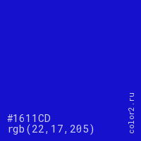 Цвет #1611CD в цветовой модели RGB обозначается тремя октетами (22, 17, 205) в десятичном формате и #1611CD в шестнадцатиричном (hex) формате, которые являются интенсивностью красного 22 (hex 16), интенсивность зелёного 17 (hex 11) и интенсивность синего 205 (hex CD).