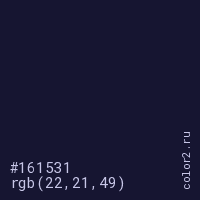 Цвет #161531 в цветовой модели RGB обозначается тремя октетами (22, 21, 49) в десятичном формате и #161531 в шестнадцатиричном (hex) формате, которые являются интенсивностью красного 22 (hex 16), интенсивность зелёного 21 (hex 15) и интенсивность синего 49 (hex 31).